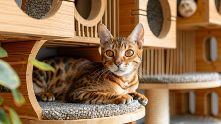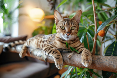 Elegantly relaxed savannah cat resting on a tree branch indoors