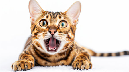 Bengal cat with open mouth. Side view. Studio shot on color background. Copy space.