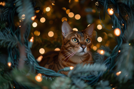 A cat is sitting in a wreath of Christmas lights. The cat is looking at the camera