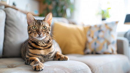 Relaxed bengal cat lounging on stylish sofa with decorative pillows