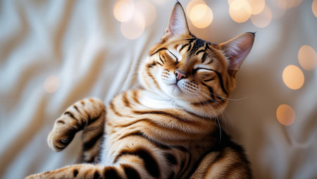 Cute bengal cat lying down with closed eyes, enjoying christmas lights in a cozy atmosphere. Ai generated image