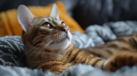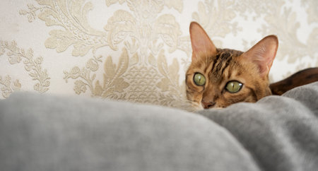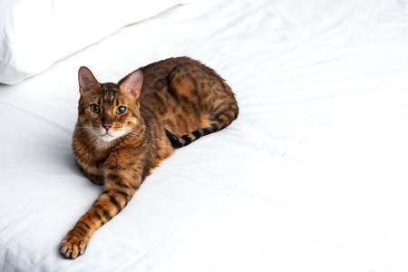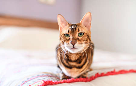 Cute purebred bengal cat resting and lying on bed. Portrait of adorable pet at home.