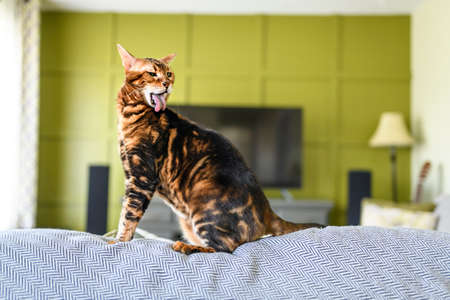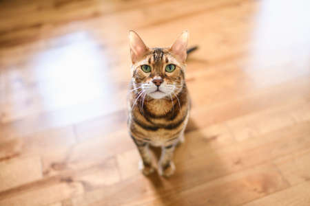 Cute young Bengal cat, in a bright modern apartment in daylight.