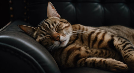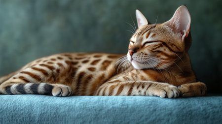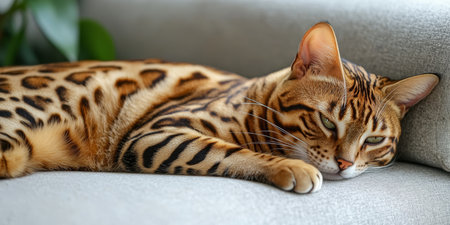 Bengal Cat Resting Peacefully on Gray Sofa, Enjoying a Cozy Nap, Perfectly Relaxed and Serene
