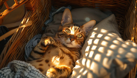 A playful Bengal kitten basks in the warm glow of sunshine, curled up in a cozy wicker basket Surrounded by soft blankets, its sleek, spotted coat glistens in the light With eyes closed and a gentle purr, the adorable feline enjoys a moment of pure relaxation and contentment AI Generative