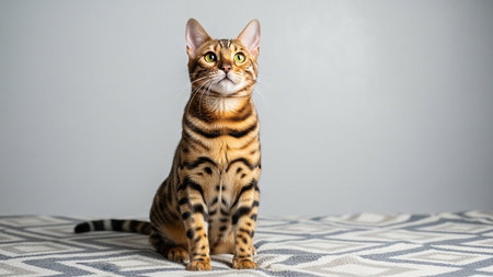 Domestic Bengal cat sitting on a patterned carpet against a grey background