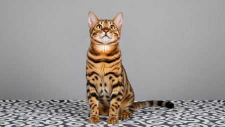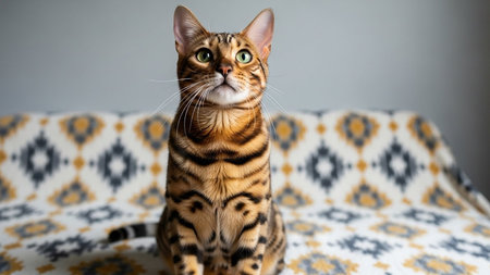 Domestic Bengal cat sitting on a patterned surface looking directly at the camera