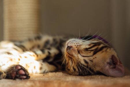 Little cute bengal kitten sleeping on a soft cat's shelf of a cat's house in a sunlight.