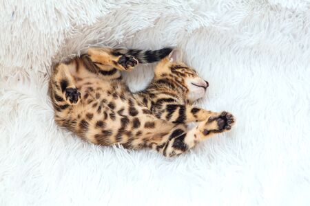 Young bengal cat is sleeping on the bed. Close-up photo. Selective focus. Banner format. Copy space.