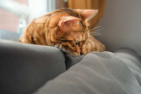 Bengal purebred cat rubs against a leather chair during estrus. A domestic cat caresses and itches from dermatitis.