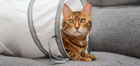 Bengal cat in a cat tunnel. Cat and accessories for cat leisure.