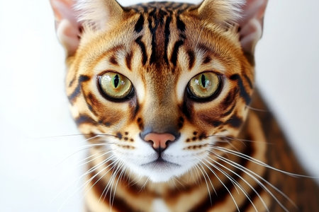 Bengal cat with beautiful spotted fur and bright green eyes, looking directly at the camera, highlighting its playful and curious nature in a neutral background
