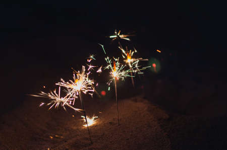 Romantic nighttime background with sparks. Beach sand at night with sparklers. Sparks of bright bengal lights burning on the beach. Defocus, blur, noise, grain effect.