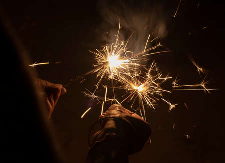 Woman's hand holding sparklers stick on fire, flame spread long light with bokeh of light bulb at night time on black background