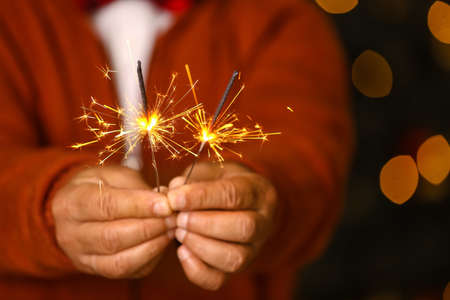 Mature man with Christmas sparklers at home, closeup