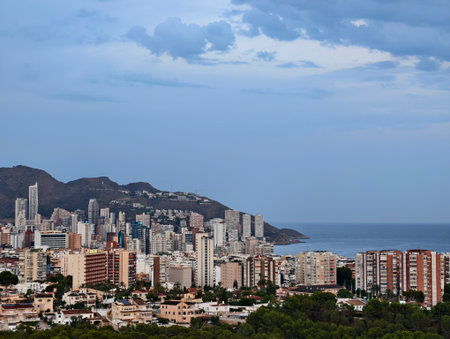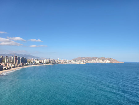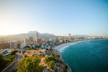 Benidorm city landscape and Mediterranean Sea from above, Alicante province, Spain. Benidorm popular Spanish resort in Costa Blanca