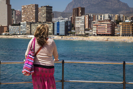 Attractive woman gazes over Playa de Levante, Benidorm, Costa Blanca, Spain.