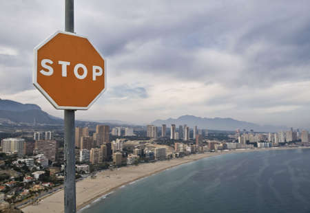 Image of protest against the excessive construction on the coastline. Composition made including a stop signal in the foreground, with the buildings situated on the background