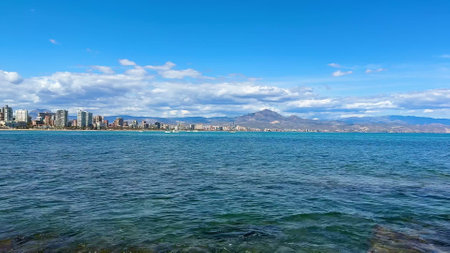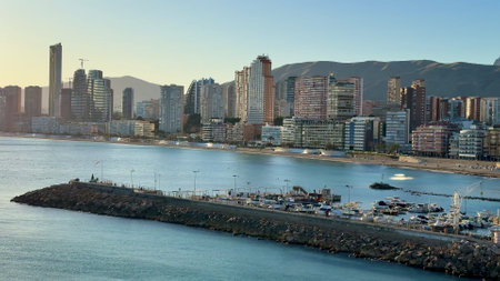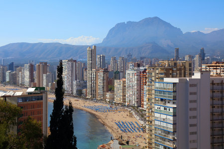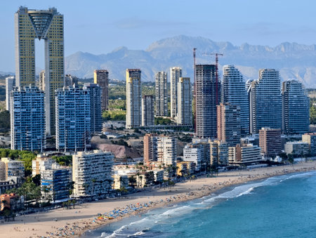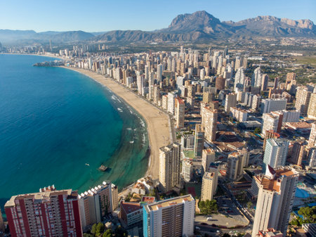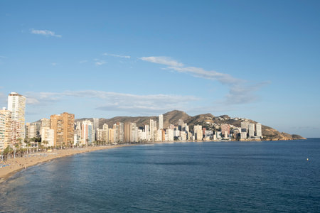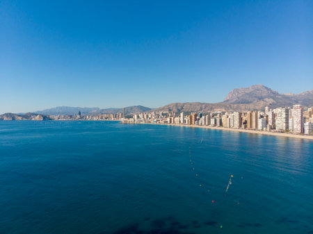 Breathtaking view of the coastline in Benidorm with high buildings, mountains and sea