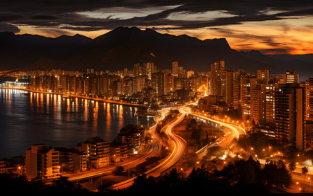 The breathtaking view of a stunning sunrise casting golden hues over the coastal city and majestic mountains