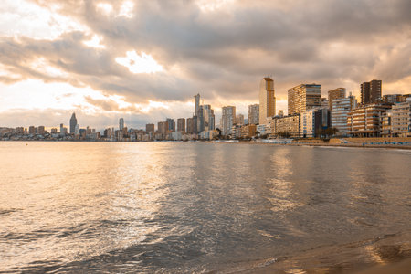 Benidorm skyline at sunset beach in Alicante of Apain