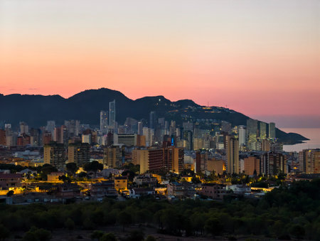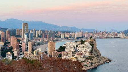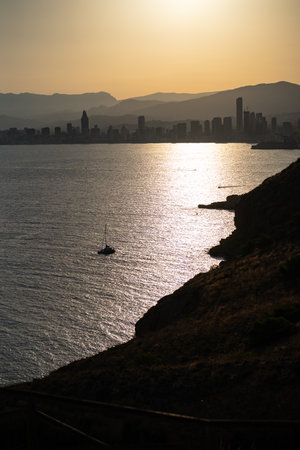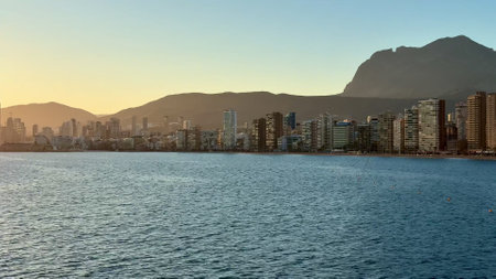Breathtaking view of the coastline in Benidorm at sunset with high buildings, mountains and sea
