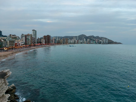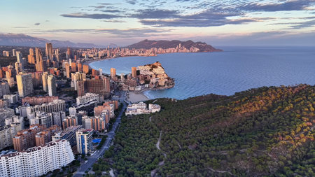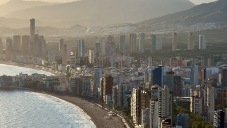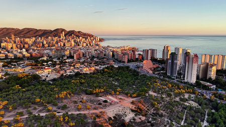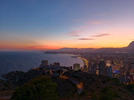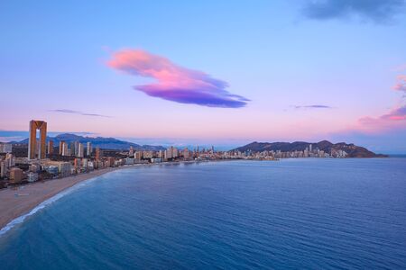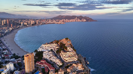 Aerial view of a Benidorm city coastline at sunset. Benidorm is a modern resort city, one of the most popular travel destinations in Spain. Costa Blanca, Alicante province