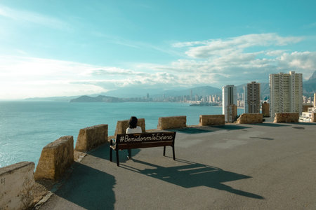 Benidorm Hiking Route Punta del Cavall, Natural Park, Torre Punta del Cavall. Woman sitting on bench with inscription Benidorm te espera and admiring beautiful view to Mediterranean sea and Benidorm