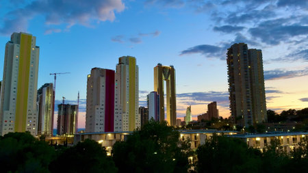 Panoramic view of the skyline of Benidorm at sunset