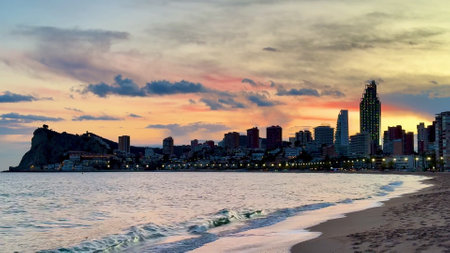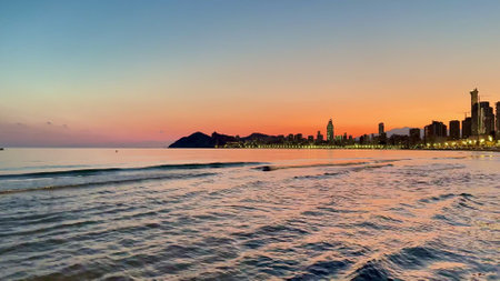 Experience the breathtaking and stunning sunset view of Benidorms skyline beautifully reflecting on the calm sea