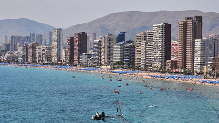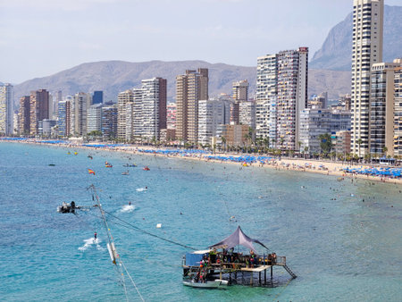 BENIDORM, SPAIN - AUGUST 16, 2020: View of skyscrapers of the city from the Mediterranean sea. The city is considered Manhattan of Spain.