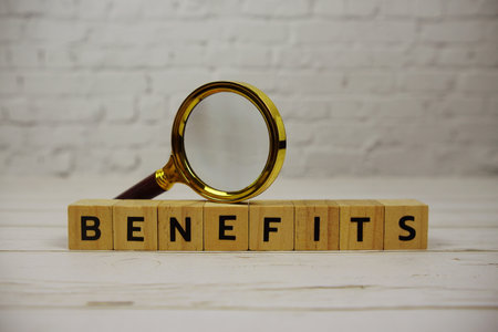 Benefits with wooden blocks alphabet letters and magnifying glass on wooden background