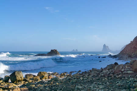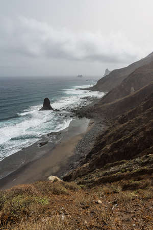 Rough rocky cliffs in the North of Tenerife. Beautiful Benijo beach in the Canary Islands. Rocks, volcanic rocks, Atlantic ocean.