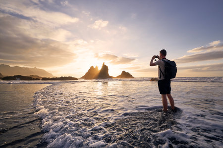 Man during photographing landscape with cliff. Young photographer on beach at beautiful sunset. Tenerife, Canary Islands, Spain.