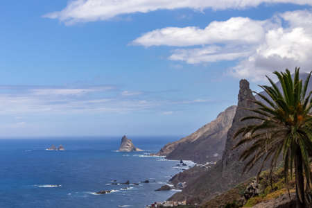 Large tropical palm trees with a panoramic view on Roque de las Animas crag and Roque en Medio in the Anaga mountain range, Tenerife, Canary Islands, Spain, Europe. Hiking trail from Afur to Taganana