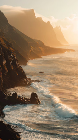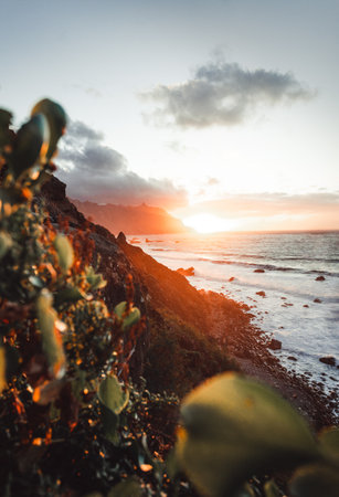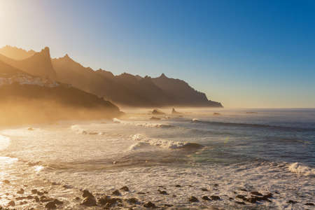 Beautiful view of rocky beach and cliff along North Tenerife coast at sunset. Atlantic wavy ocean with golden sun in Canary Islands.