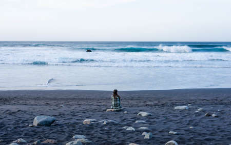 Summer yoga session on beautiful Playa de Roque de Las Bodegas with giant rock and high waves - tropical Tenerife island, Canary in Spain. Vriksha-asana, tree pose