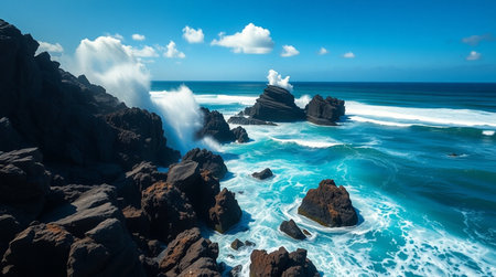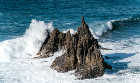 The rough Atlantic Ocean near Tenerife, Spain, strong waves break on the rocks in the water