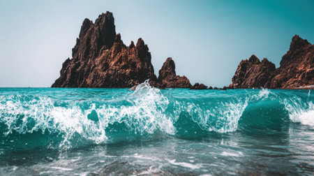 A low-angle view of a vibrant turquoise sea wave with white foam cresting in the foreground. In the background, majestic dark rock formations rise from the ocean under a clear sky.
