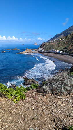 Beautiful landscape of Benijo beach with black volcanic sand and waves. Green mountain slopes. Anaga Rural Park, municipality of Santa Cruz de Tenerife. Canary Islands, Spain.