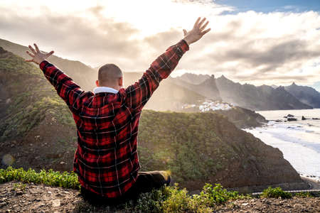 One happy man sitting, relaxing and looking at beautiful ocean landscape with mountains. Back view. Mindfulness.