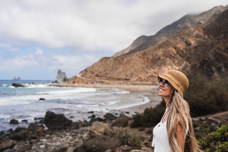 A woman enjoys the coastal scenery at a remote beach while wearing a hat