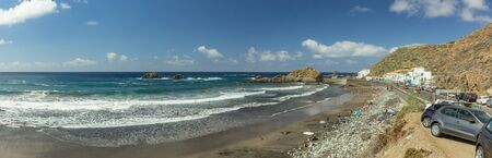 Panoramic view of Aimasiga beach with volcanic black sand and lone rocks sticking out of the sea foam on the north coast of the island Tenerife, Spain. Sunny day, blue sky. Wide ange lens Panorama.