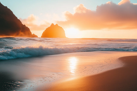 Calm sunset casts warm hues over ocean waves, creating a serene and tranquil scene for all to enjoy. Generative AI