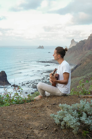Young long hair man in casual attire, plays a ukulele on a cliff edge, overlooking a tranquil ocean and rugged cliffs