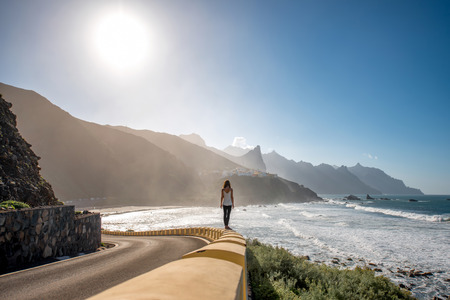 Woman walking near the mountain road near Taganana village on Tenerife island