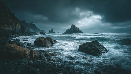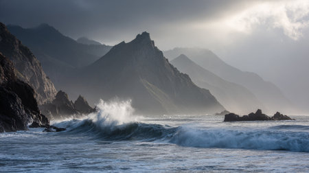 Discover a breathtaking coastal scene featuring powerful waves crashing against rugged rocks, with majestic mountains looming under dramatic skies, evoking tranquility.