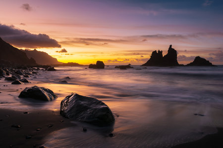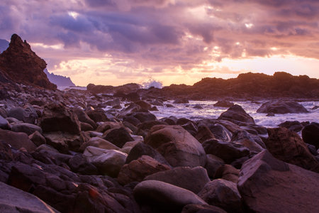 Amazing sunset with dramatic sky at Playa Benijo on Tenerife, Canary Islands, Spain. Ideal for travel and tourism concept.