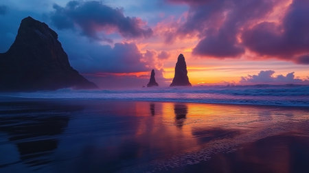 As daylight fades, stunning hues of orange and purple illuminate the sky above the Oregon Coast, casting reflections on tranquil waters near towering rock formations.
