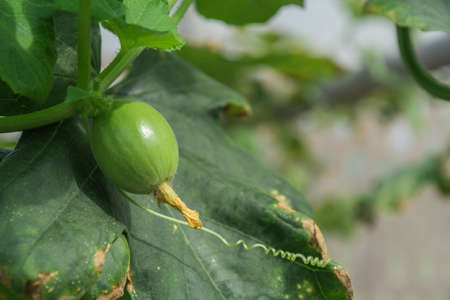 Melon fruit development. Small green immature fluffy Ethiopian melon on a bush. Selective focus.